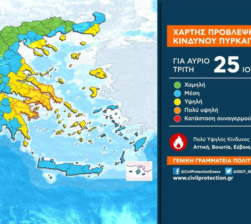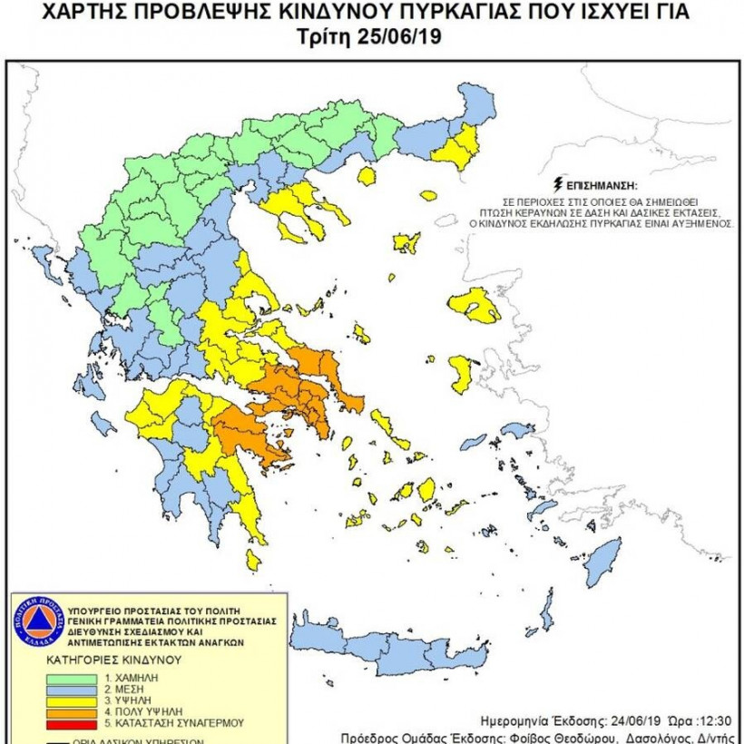 Σύμφωνα με το Χάρτη Πρόβλεψης Κινδύνου Πυρκαγιάς που εκδίδει η Γενική Γραμματεία Πολιτικής Προστασίας του Υπουργείου Εσωτερικών και Διοικητικής Ανασυγκρότησης, για σήμερα Τρίτη, 25 Ιουνίου, προβλέπεται πολύ υψηλός κίνδυνος πυρκαγιάς (κατηγορία κινδύνου 4), σε ορισμένες περιοχές.