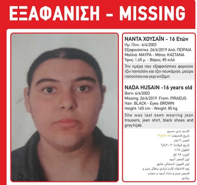Ένα 16χρονο κορίτσι, Iρακινής καταγωγής, η Νάντα Χουσαΐν, εξαφανίστηκε από το σπίτι της, τις πρωινές ώρες της 26ης Ιουνίου, στην περιοχή του Πειραιά.