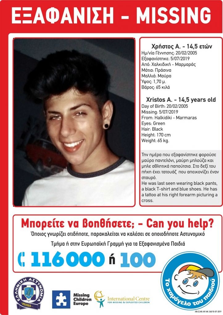 «Στις 5/07/2019, και ώρα 19:00, εξαφανίστηκε από την περιοχή του Μαρμαρά Χαλκιδικής, ο Χρήστος Α., 14,5 ετών. Για την εν λόγω εξαφάνιση, ενημερωθήκαμε την Τετάρτη 10/07/2019 βραδινές ώρες, όταν και λάβαμε τα απαραίτητα στοιχεία του παιδιού, προκειμένου να προβούμε στη δημοσιοποίησή τους. Ο Χρήστος Α. έχει ύψος 1,70 μ., έχει 65 κιλά βάρος, έχει μαύρα μαλλιά και πράσινα μάτια. Ο Χρήστος Α. φορούσε μαύρο παντελόνι, μαύρη μπλούζα και μπλε παπούτσια. Στο δεξί του πήχη έχει τατουάζ που απεικονίζει έναν σταυρό.