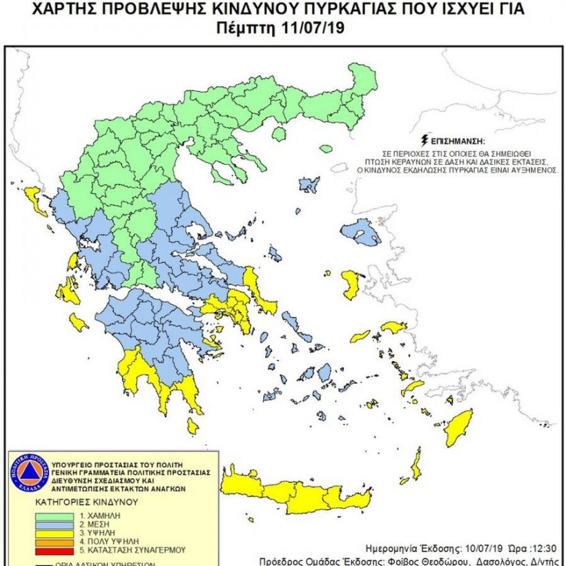 Σύμφωνα με το Χάρτη Πρόβλεψης Κινδύνου Πυρκαγιάς που εκδίδει η Γενική Γραμματεία Πολιτικής Προστασίας του Υπουργείου Εσωτερικών και Διοικητικής Ανασυγκρότησης, για σήμερα Πέμπτη, 11 Ιουλίου, προβλέπεται υψηλός κίνδυνος πυρκαγιάς (κατηγορία κινδύνου 3), σε ορισμένες περιοχές.