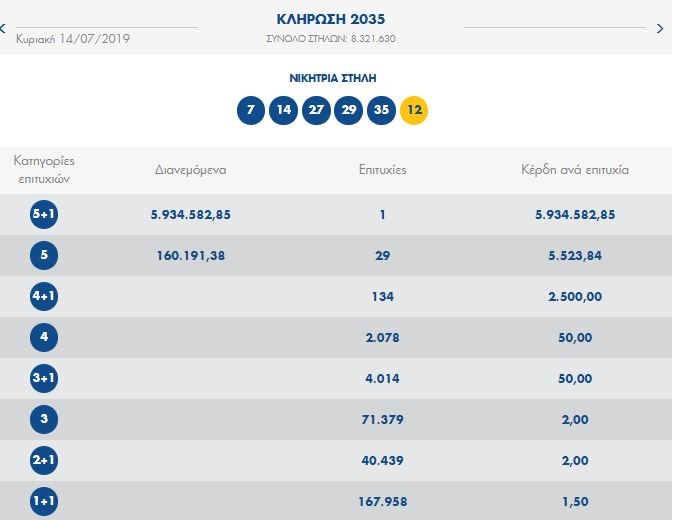 Οι τυχεροί αριθμοί που έβγαλε η κληρωτίδα της κλήρωσης της Κυριακής είναι οι: 7, 14, 27, 29, 35 και Τζόκερ το 12.