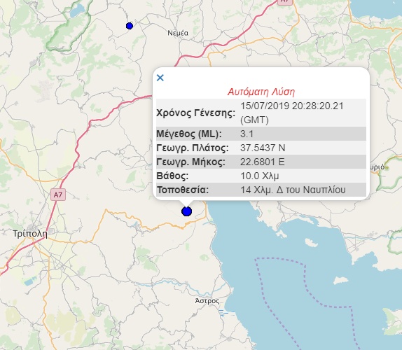 Η αρχική εκτίμηση του Γεωδυναμικού Ινστιτούτου ήταν ότι η σεισμική δόνηση σημειώθηκε στις 23:28 14χλμ δυτικά του Ναυπλίου και είχε μέγεθος 3,1 Ρίχτερ.