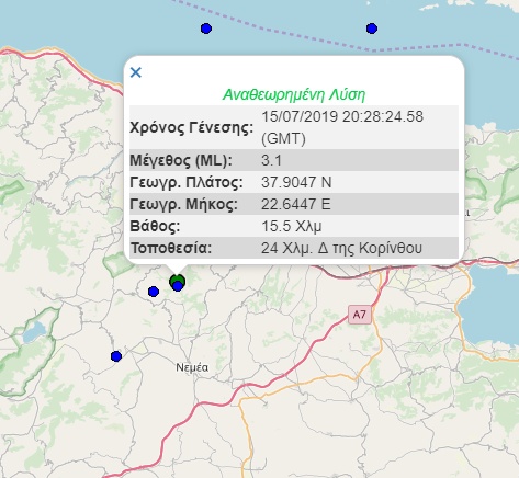 Σύμφωνα με το Γεωδυναμικό Ινστιτούτο ο σεισμός σημειώθηκε στις 23:28 24χλμ δυτικά της Κορίνθου και είχε μέγεθος 3,0 Ρίχτερ.