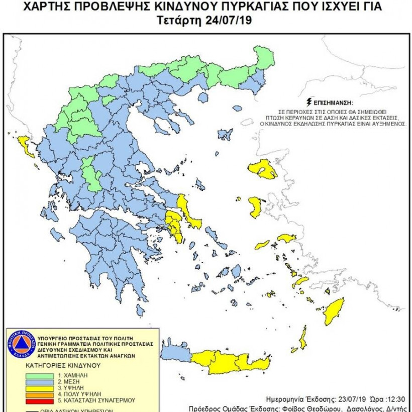 Σύμφωνα με το Χάρτη Πρόβλεψης Κινδύνου Πυρκαγιάς που εκδίδει η Γενική Γραμματεία Πολιτικής Προστασίας του Υπουργείου Εσωτερικών και Διοικητικής Ανασυγκρότησης, για σήμερα Τετάρτη, 24 Ιουλίου, προβλέπεται υψηλός κίνδυνος πυρκαγιάς (κατηγορία κινδύνου 3), σε ορισμένες περιοχές της Ελλάδας.