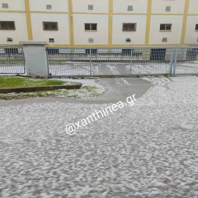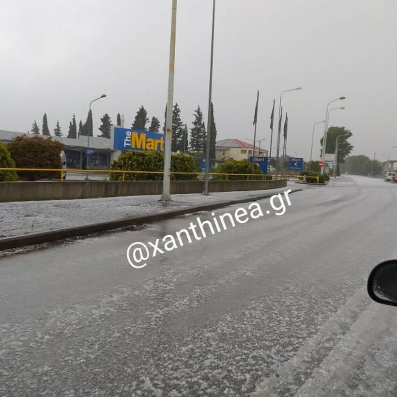 Το χαλάζι άρχισε να πέφτει στην Ξάνθη λίγο μετά τις 11.00 το πρωί της Κυριακής. Οι ουρανοί “άνοιξαν” και αρχικά έπεφτε δυνατή βροχή, η οποία στη συνέχεια μετατράπηκε σε χαλάζι.