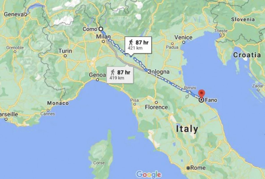 Ο 48χρονος (δεν έχει γίνει γνωστό το όνομά του) φέρεται να περπάτησε για μια εβδομάδα για να απαλύνει τα νεύρα του μετά από καβγά με τη σύντροφό του. Ο περίπατος του ξεκίνησε από Κόμο, στη βόρεια Ιταλία κοντά στα ελβετικά σύνορα και τελείωσε 450 χιλιόμετρα νότια στη μικρή πόλη Φάνο στις ακτές της Αδριατικής.
