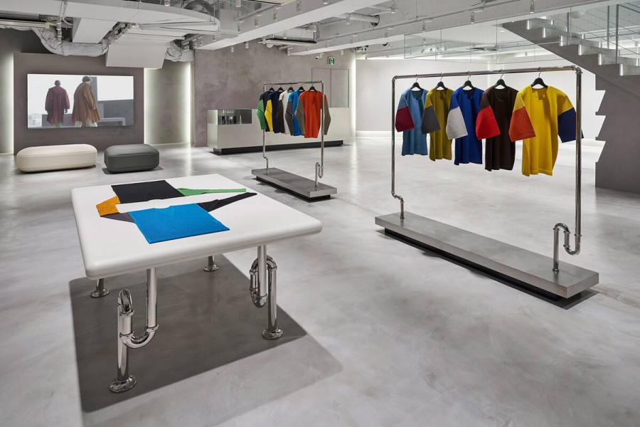 Στο εσωτερικό, στο ισόγειο του καταστήματος, τα ρούχα κρέμονται από μεταλλικές σιδεριές που έχουν διαμορφωθεί για να μιμούνται σωλήνες νερού.