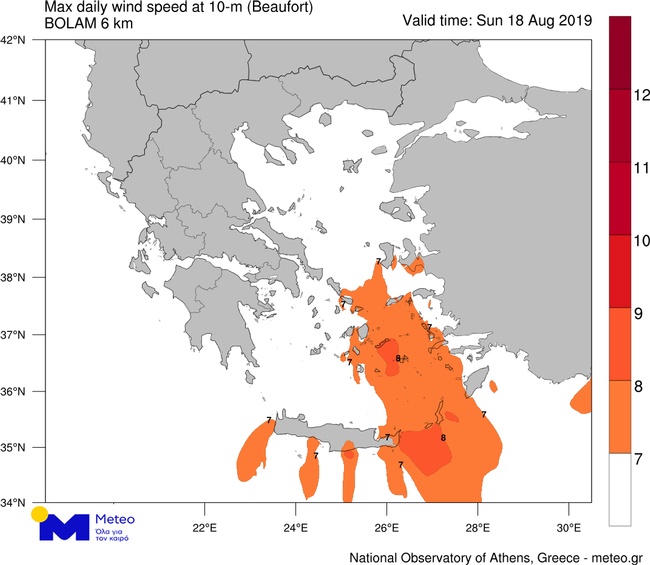 Οι εντάσεις των ανέμων σύμφωνα με τα προγνωστικά στοιχεία θα φτάνουν γενικά τα 7 μποφόρ, ενώ στις Νοτιοανατολικές Κυκλάδες, στην Ανατολική Κρήτη και στο Καρπάθιο Πέλαγος αναμένονται εντάσεις έως 8 μποφόρ και ενδεχομένως πρόσκαιρα τοπικά 9 μποφόρ.