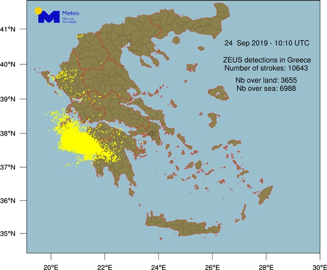 Το σύστημα καταγραφής κεραυνών «ΖΕΥΣ» του Εθνικού Αστεροσκοπείου Αθηνών κατέγραψε πάνω από 10.500 κεραυνούς έως τις 13:00, εκ των οποίων περίπου 7.000 πάνω από την θάλασσα και 3.500 πάνω από την ξηρά.