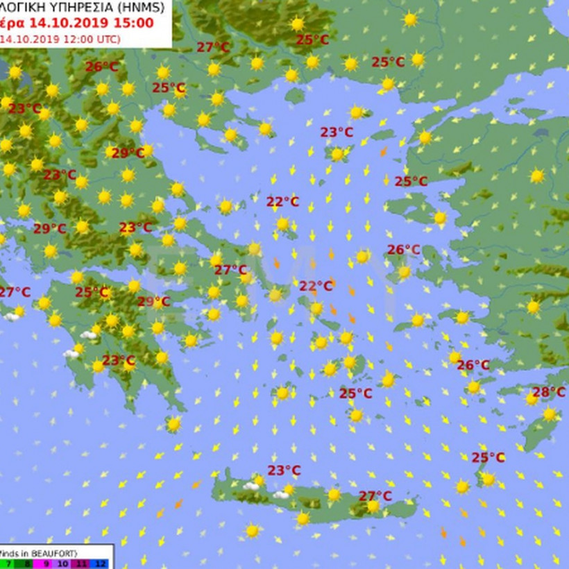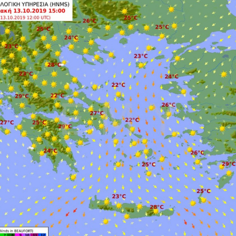 Οι άνεμοι πνέουν από βόρειες διευθύνσεις 3 με 5 και στο Αιγαίο 6 μποφόρ.