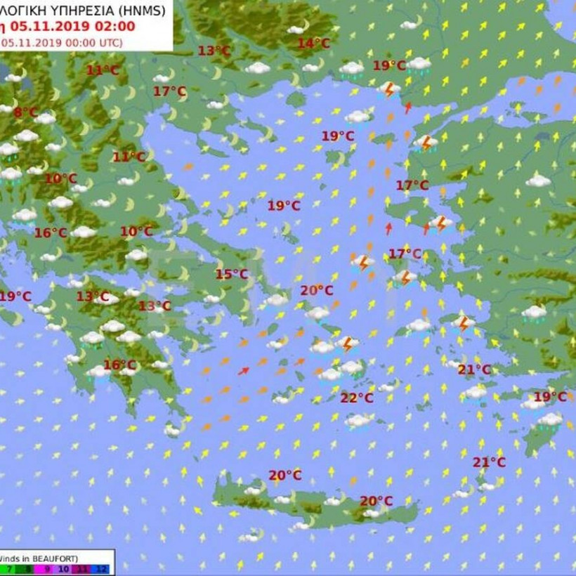 Άνεμοι: Από νότιες διευθύνσεις 5 με 6 και τοπικά 7 μποφόρ. Τη νύχτα θα στραφούν σε νοτιοδυτικούς και θα εξασθενήσουν.