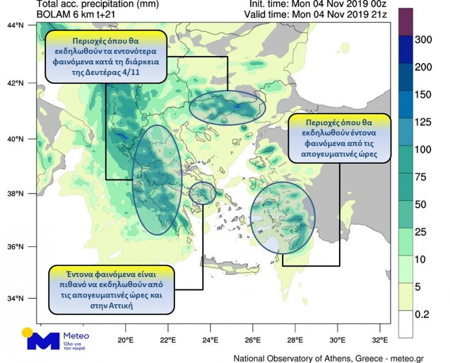 - Μέχρι το βράδυ της Δευτέρας (4/11), οπότε αναμένεται βαθμιαία εξασθένηση από τα βορειοδυτικά, τα νησιά του Ιονίου, η Ήπειρος, η δυτική Στερεά και σταδιακά η δυτική και η νότια Πελοπόννησος.