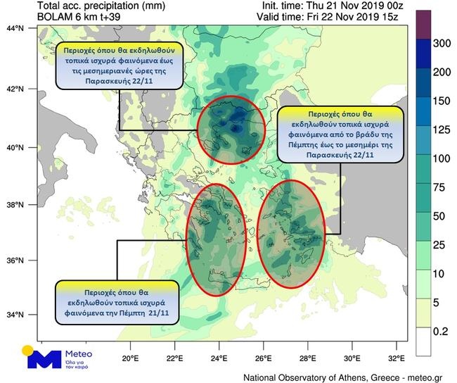 Σήμερα, Παρασκευή 22 Νοεμβρίου 2019 περιμένουμε τοπικά ισχυρές βροχές και καταιγίδες στα ανατολικά ηπειρωτικά και στις Σποράδες, περιοχές όπου γρήγορα θα σταματήσουν, στην Κεντρική και Ανατολική Μακεδονία, στη Θράκη, στα νησιά του Βόρειου και Ανατολικού Αιγαίου, στα ανατολικά τμήματα των Κυκλάδων και της Κρήτης και στα Δωδεκάνησα.