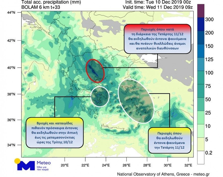 Στον προγνωστικό χάρτη του meteo.gr που ακολουθεί παρουσιάζονται οι αθροιστικές ποσότητες υετού (βροχές / καταιγίδες / χιονοπτώσεις) της «Διδούς», έως τις βραδινές ώρες της Τετάρτης (11/12).
