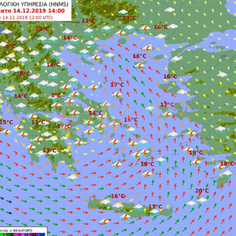 Άνεμοι: Από νότιες διευθύνσεις 5 με 7, στα ανατολικά 8 και στα νότια έως 9 μποφόρ. Σταδιακά το απόγευμα και από τα βόρεια θα στραφούν σε βόρειους 7 με 8 μποφόρ.