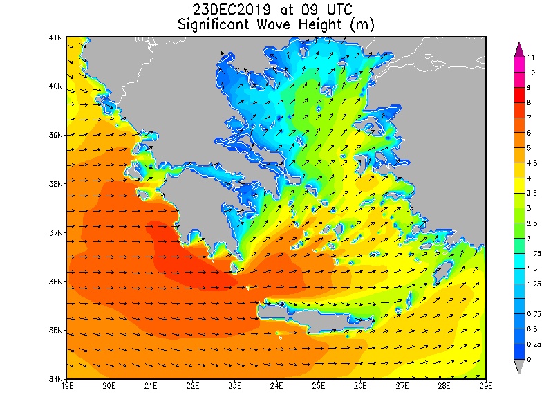 Οι άνεμοι θα πνέουν στο Αιγαίο γενικά από δυτικές διευθύνσεις σχεδόν θυελλώδεις έως θυελλώδεις 7-8 μποφόρ και στο Κεντρικό και Νότιο Αιγαίο πολύ θυελλώδεις 9 μποφόρ.