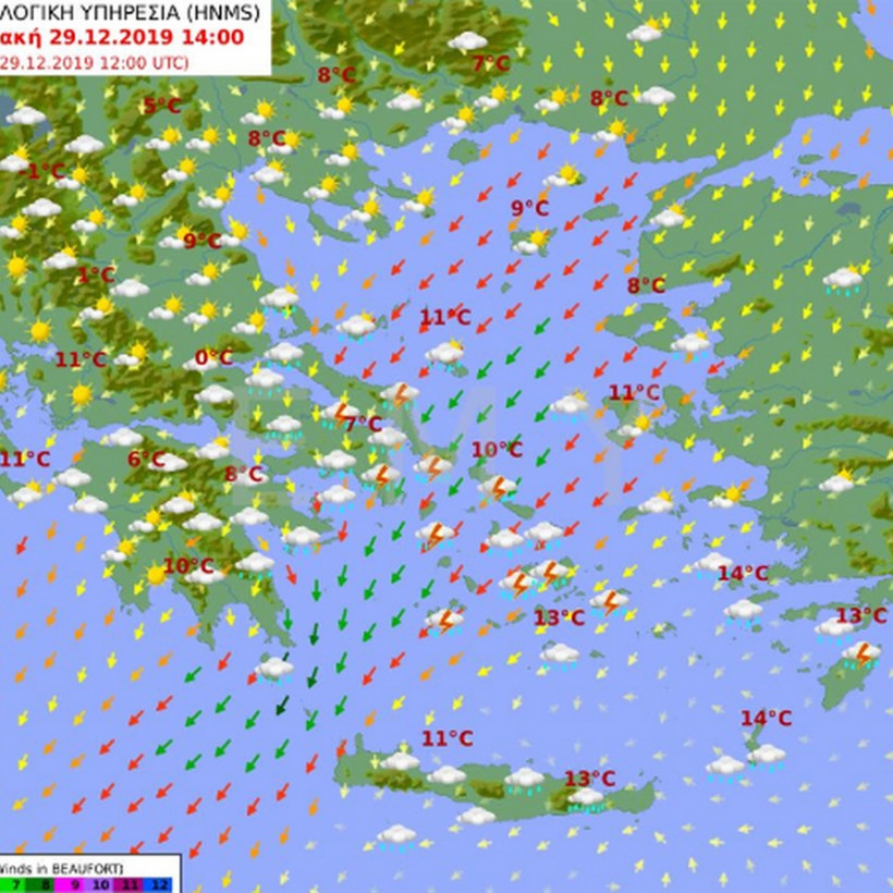 Άνεμοι: Βόρειοι βορειοανατολικοί 5 με 7, στα ανατολικά 7 με 8 και βαθμιαία 8 με 9 μποφόρ.
