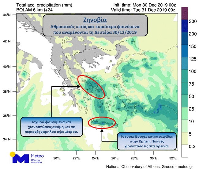 Πιο αναλυτικά, τη Δευτέρα 30/12 αναμένονται χιονοπτώσεις ακόμη και σε περιοχές χαμηλού υψομέτρου της Ανατολικής Θεσσαλίας και Στερεάς Ελλάδας, της Εύβοιας και της Βορειοανατολικής Πελοποννήσου και στα ορεινά της Κρήτης. Ασθενείς τοπικές χιονοπτώσεις θα σημειωθούν στη Θράκη και στη Δυτική Μακεδονία. Ισχυρές βροχές και καταιγίδες θα σημειωθούν στο Ανατολικό, Κεντρικό και Νότιο Αιγαίο και ιδιαίτερα στην Κρήτη καθώς και στην Αττική, την Εύβοια και την Βοιωτία. Ο ολικός υετός (βροχή/χιόνι) καθώς και τα σημαντικότερα φαινόμενα που αναμένονται έως το βράδυ της Δευτέρας 30/12 παρουσιάζεται στον χάρτη που ακολουθεί.