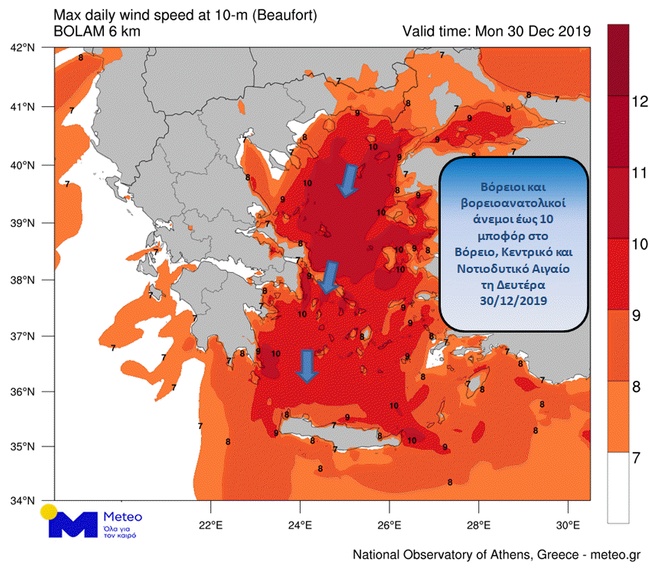 Παράλληλα, θυελλώδεις βόρειοι άνεμοι με ριπές που κατά τόπους ξεπερνούν από 130 χλμ/ώρα (Παξιμάδα Καρύστου – 140 χλμ/ώρα, Πόρτο Τήνου – 132 χλμ/ώρα), πνέουν στο Βόρειο, Κεντρικό και Νοτιοδυτικό Αιγαίο. Τα φαινόμενα θα συνεχιστούν και για το υπόλοιπο της Δευτέρας 30/12, ενώ ύφεση θα παρουσιάσουν κυρίως κατά τη διάρκεια της Τρίτης 31/12.
