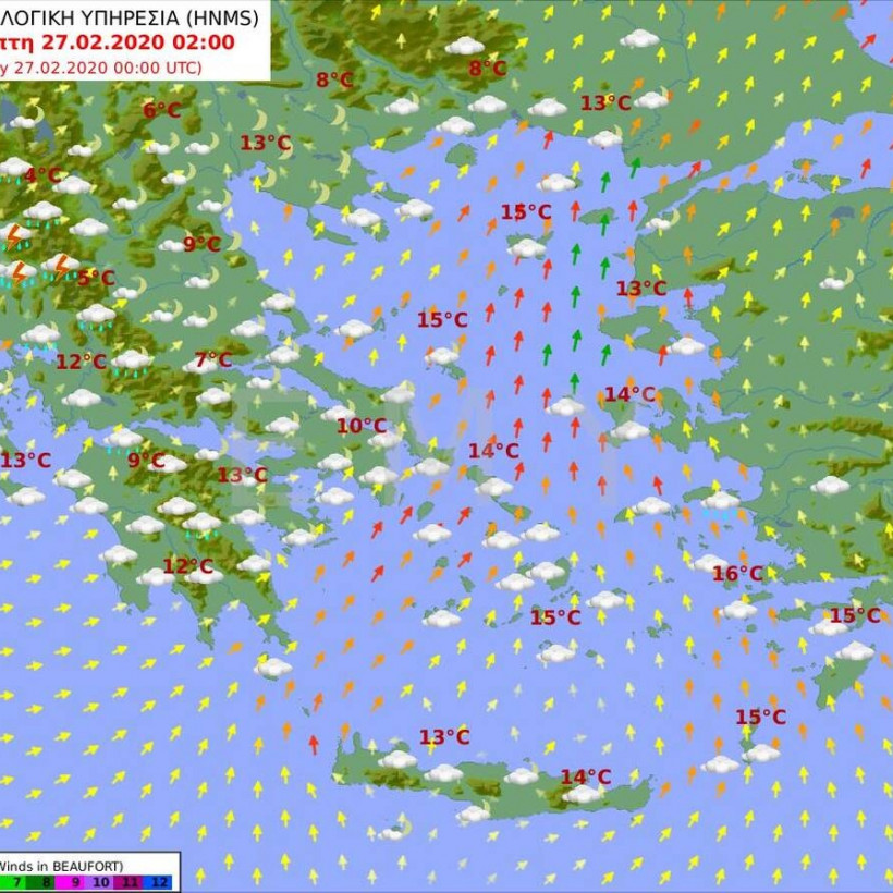 Οι άνεμοι θα πνέουν νότιοι νοτιοδυτικοί στα δυτικά 3 με 5 και στα ανατολικά 4 με 6 και τοπικά στο Αιγαίο 7 μποφόρ.