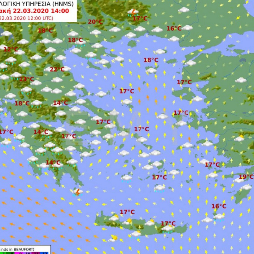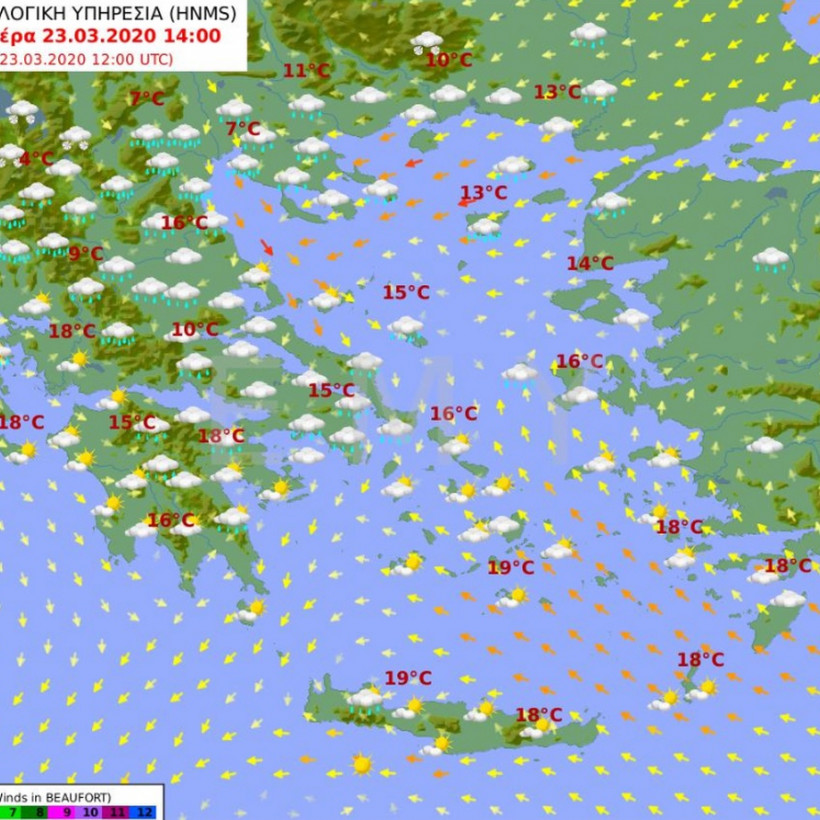 Άνεμοι: Νότιοι νοτιοανατολικοί 4 με 5 και από το απόγευμα ανατολικοί νοτιοανατολικοί 5 με 6 μποφόρ.