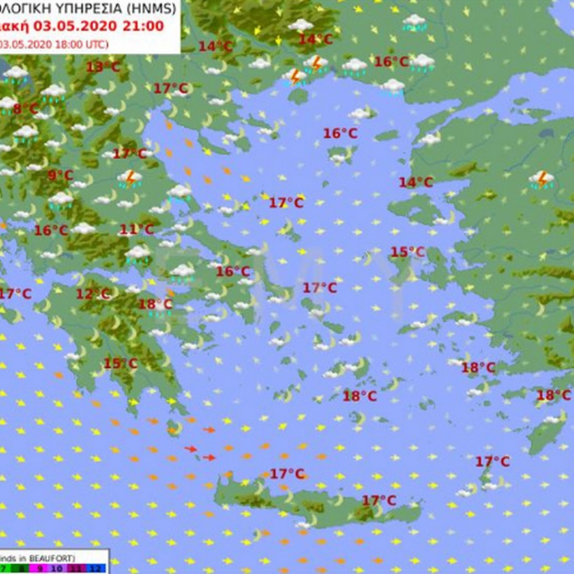 Οι άνεμοι πνέουν δυτικοί βορειοδυτικοί 3 με 5 και στα νότια και δυτικά πελάγη τοπικά 6 μποφόρ.