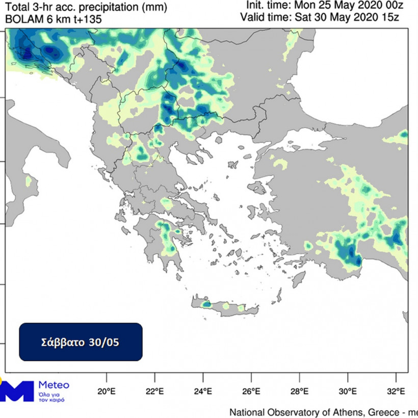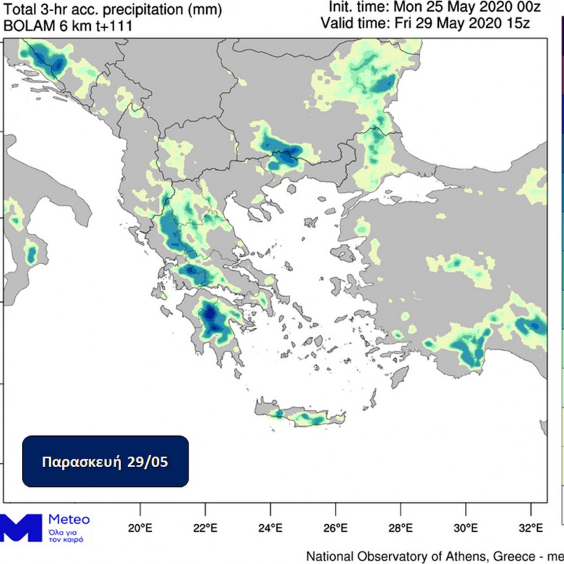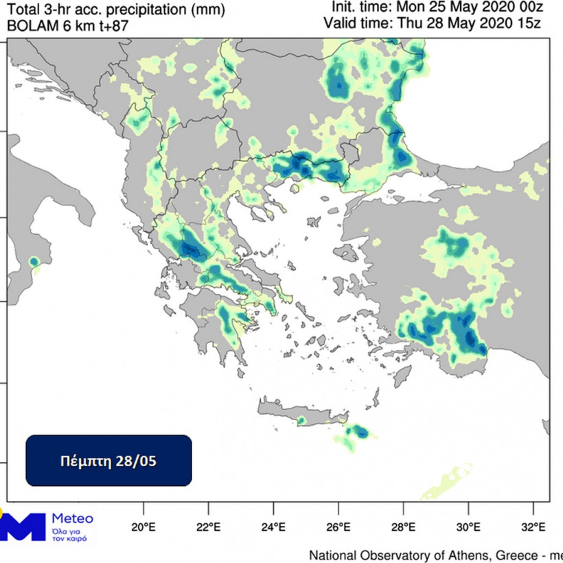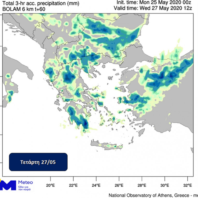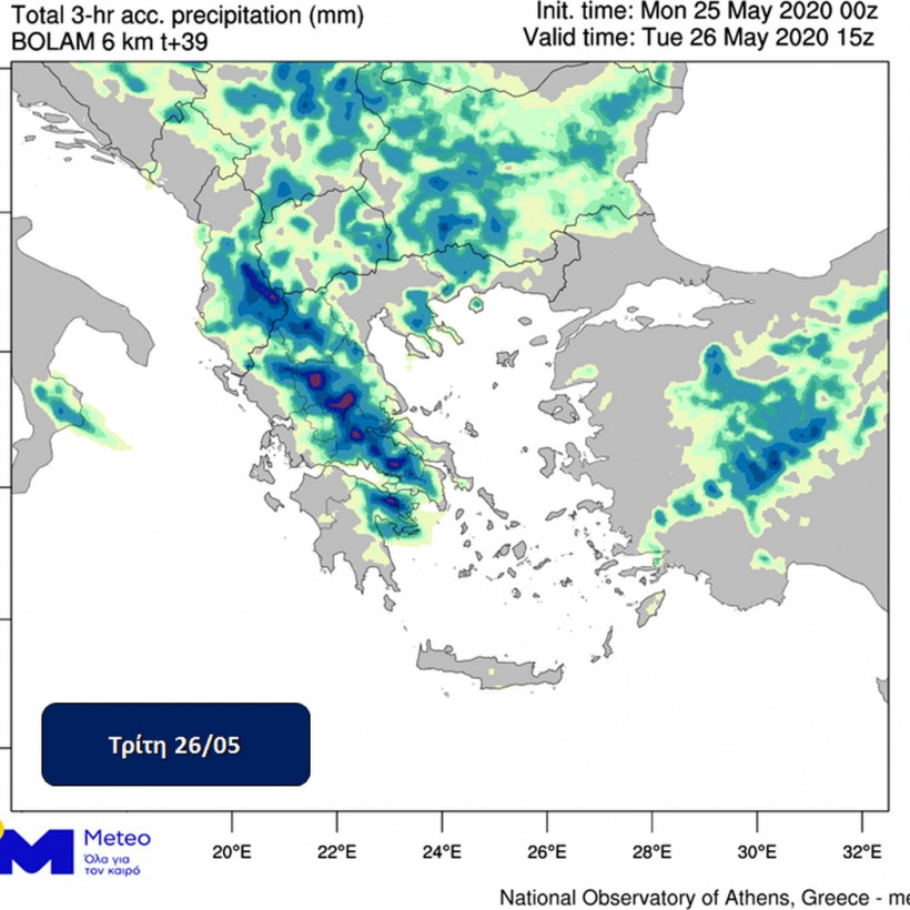 Σύμφωνα με τα προγνωστικά στοιχεία του Εθνικού Αστεροσκοπείου Αθηνών/meteo.gr από την Τρίτη 26/05 και σχεδόν μέχρι το τέλος της εβδομάδας θα εκδηλωθούν σε πολλές περιοχές της χώρας έντονες βροχοπτώσεις και τοπικά ισχυρές καταιγίδες οι οποίες σε αρκετές περιπτώσεις θα συνοδεύονται από χαλαζοπτώσεις και πολύ ενισχυμένους ριπαίους ανέμους.