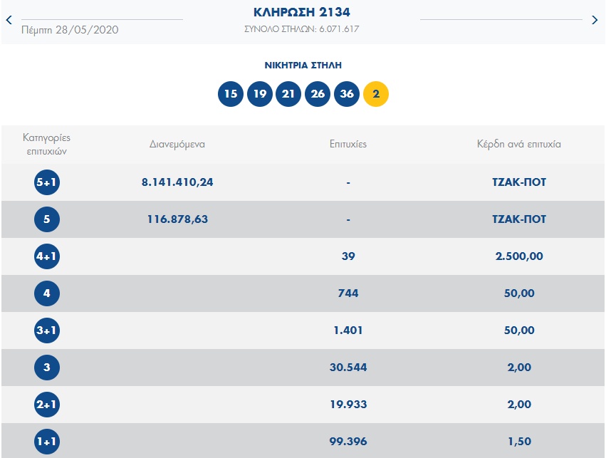 Οι τυχεροί αριθμοί που ανέδειξε η κληρωτίδα της αποψινής κλήρωσης είναι οι: 15, 19, 21, 26, 36 και Τζόκερ ο αριθμός 2.