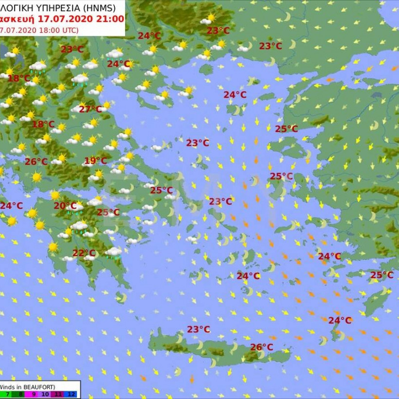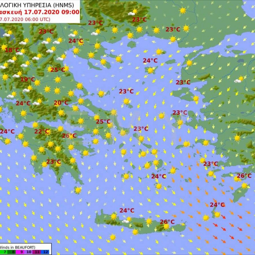 Θερμοκρασία: Από 21 έως 29 και στη νότια Κρήτη έως 31 βαθμούς Κελσίου.