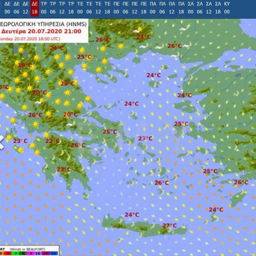 Θερμοκρασία: Από 18 έως 31 βαθμούς Κελσίου. Στην Ήπειρο η ελάχιστη κατά τόπους 3 με 5 βαθμούς χαμηλότερη.