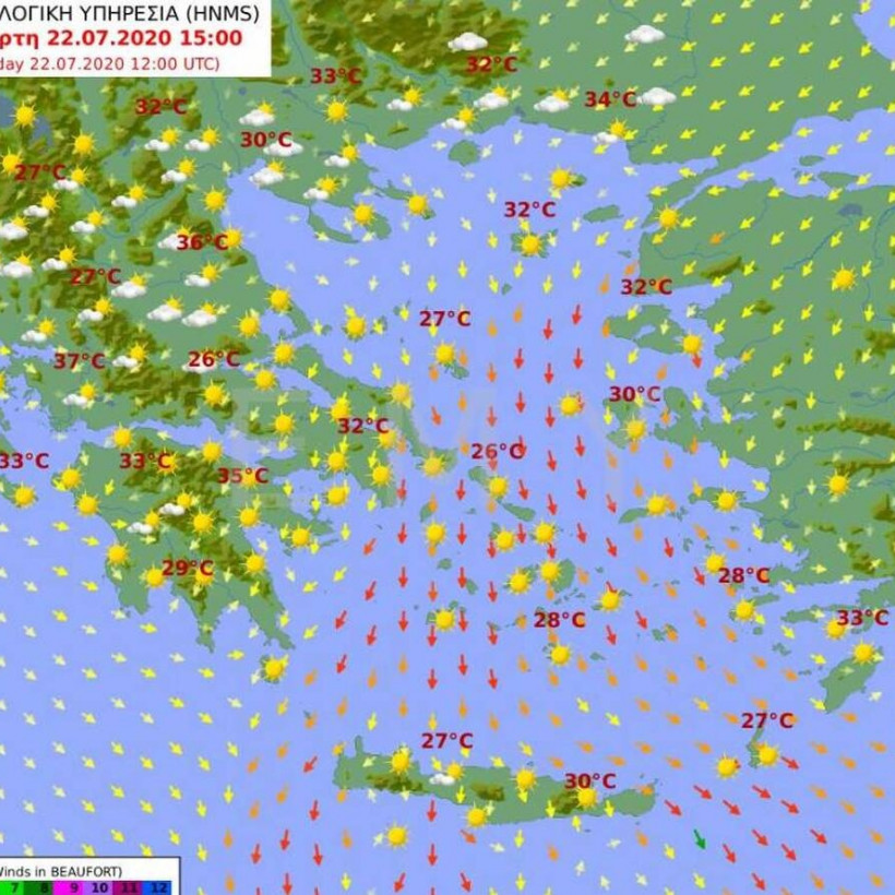 Θερμοκρασία: Από 22 έως 30 και στη νότια Κρήτη έως 33 βαθμούς Κελσίου.