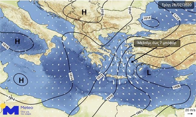 Παράλληλα το μελτέμι στο Αιγαίο θα συνεχίσει να πνέει ισχυρό τις απογευματινές ώρες της Τρίτης 28/07, φτάνοντας τοπικά τα 7 μποφόρ στις Ανατολικές Κυκλάδες και τα Δωδεκάνησα.