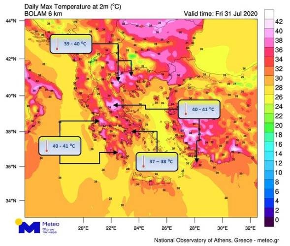 Σύμφωνα με τα προγνωστικά στοιχεία του Εθνικού Αστεροσκοπείου Αθηνών / meteo.gr, μικρή περαιτέρω άνοδο σημείωσε η θερμοκρασία την Παρασκευή 31/07, ξεπερνώντας κατά τόπους τους 40 βαθμούς Κελσίου.