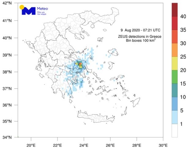 Αξιόλογη ήταν και η κεραυνική δραστηριότητα στους τρείς προαναφερθέντες νομούς, όπως φαίνεται και στο χάρτη που ακολουθεί και παρουσιάζει την ένταση της έως το πρωί της Κυριακής 09/08, σύμφωνα με το σύστημα «ΖΕΥΣ» του Εθνικού Αστεροσκοπείου Αθηνών.