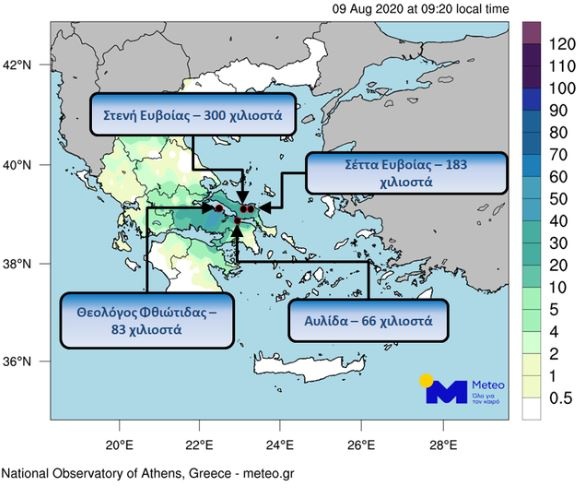 Ενδεικτικά από την αρχή των φαινομένων, αργά το βράδυ του Σαββάτου 08/08, έως το πρωί της Κυριακής 09/08, στη Σέττα Ευβοίας καταγράφηκαν 183 χιλιοστά, στην Αυλίδα 66 χιλιοστά και στο Θεολόγο Φθιώτιδας 83 χιλιοστά βροχής.