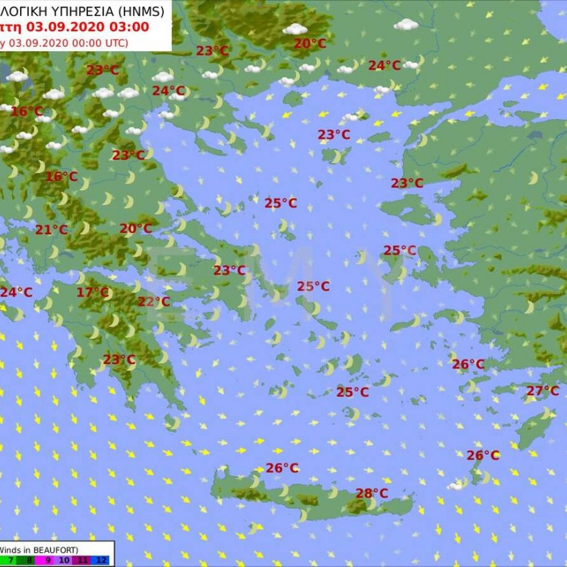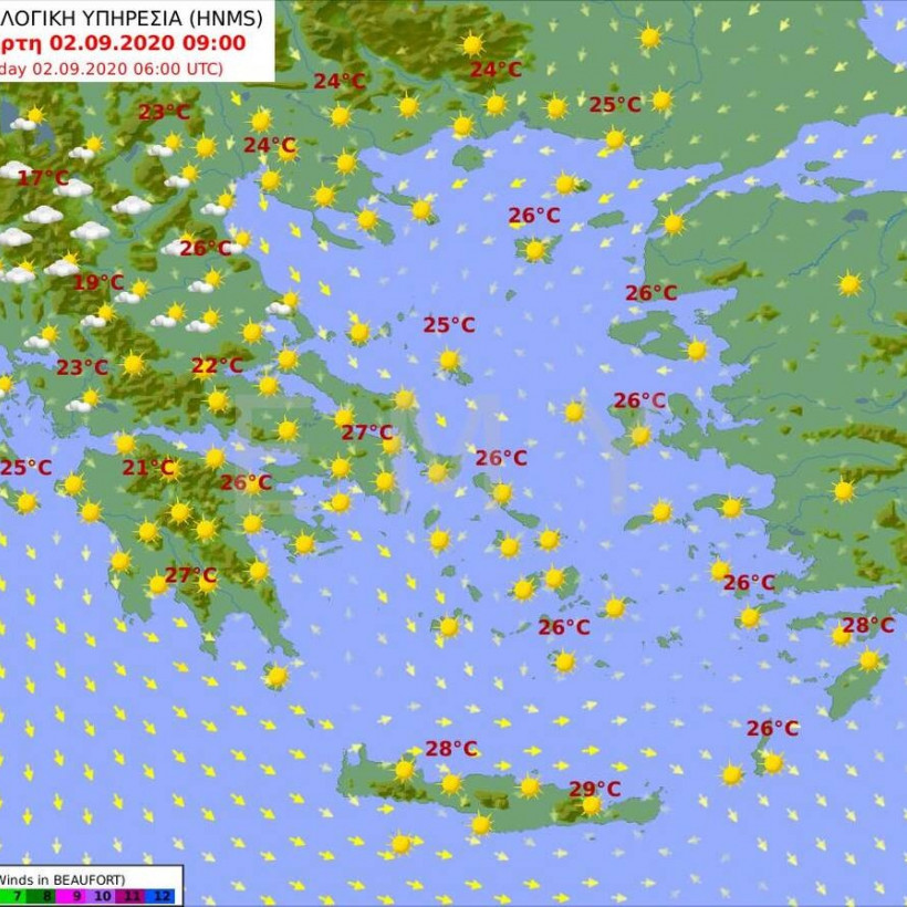 Θερμοκρασία: Από 20 έως 34 και στα ηπειρωτικά έως 37 βαθμούς Κελσίου. Στην Ήπειρο η ελάχιστη 3 με 4 βαθμούς χαμηλότερη.