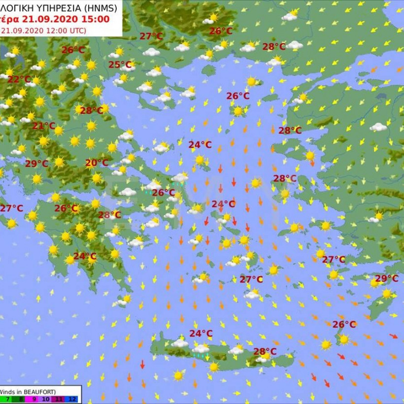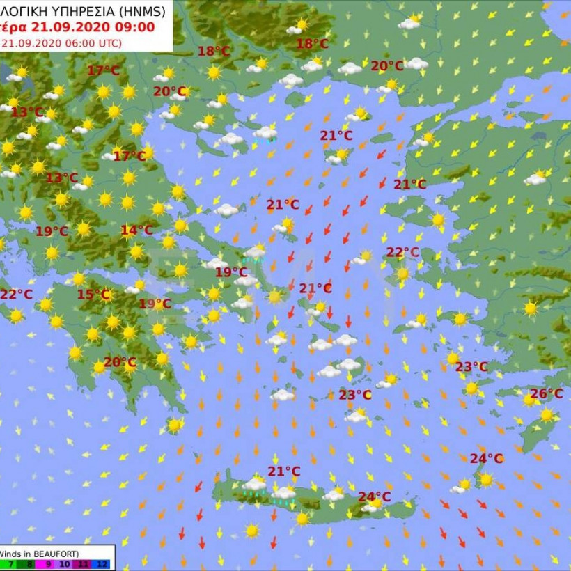 Θερμοκρασία: Από 19 έως 27 και τοπικά στη νότια Κρήτη έως 29 βαθμούς Κελσίου.