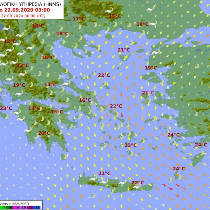 Οι άνεμοι θα πνέουν στα ανατολικά μεταβλητοί 4, στο Αιγαίο βόρειοι 4 με 5 και στα νοτιοανατολικά τοπικά 6 και στα δυτικά νοτιοδυτικοί 3 με 5 μποφόρ.