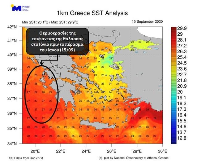 Παράλληλα, σύμφωνα με τις παρατηρήσεις που μας παρέχουν οι μετεωρολογικοί δορυφόροι σημαντική ήταν επίδραση του ΙΑΝΟΥ στις θερμοκρασίες της επιφάνειας της θάλασσας στο Ιόνιο, και ιδιαίτερα στις περιοχές όπου βρέθηκε κατά τη φάση της μεγαλύτερης ισχύος του. Στους χάρτες που ακολουθούν επισημαίνονται σε κύκλο οι περιοχές όπου μεταξύ 15/09 και 20/09 οι θερμοκρασίες της επιφάνειας της θάλασσας υποχώρησαν έως και κατά 3 βαθμούς Κελσίου.