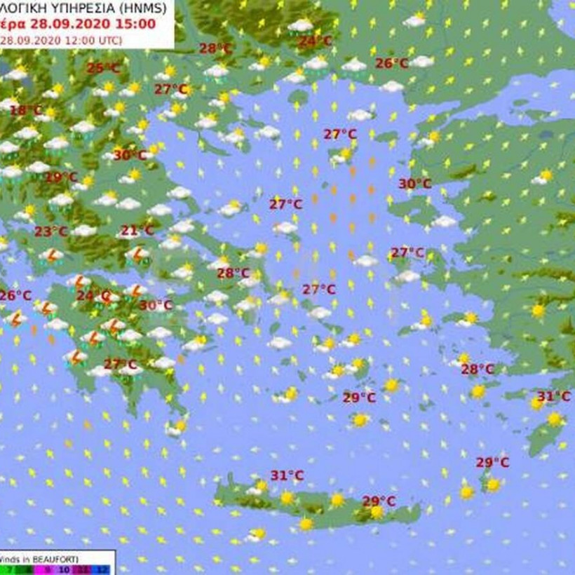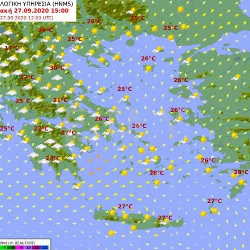 Άνεμοι: Δυτικοί νοτιοδυτικοί 3 με 5 μποφόρ, βαθμιαία στα νότια μεταβλητοί 3 με 4 και στα βόρεια νότιοι 3 με 5 μποφόρ.