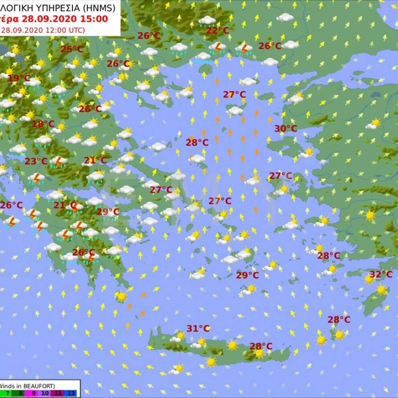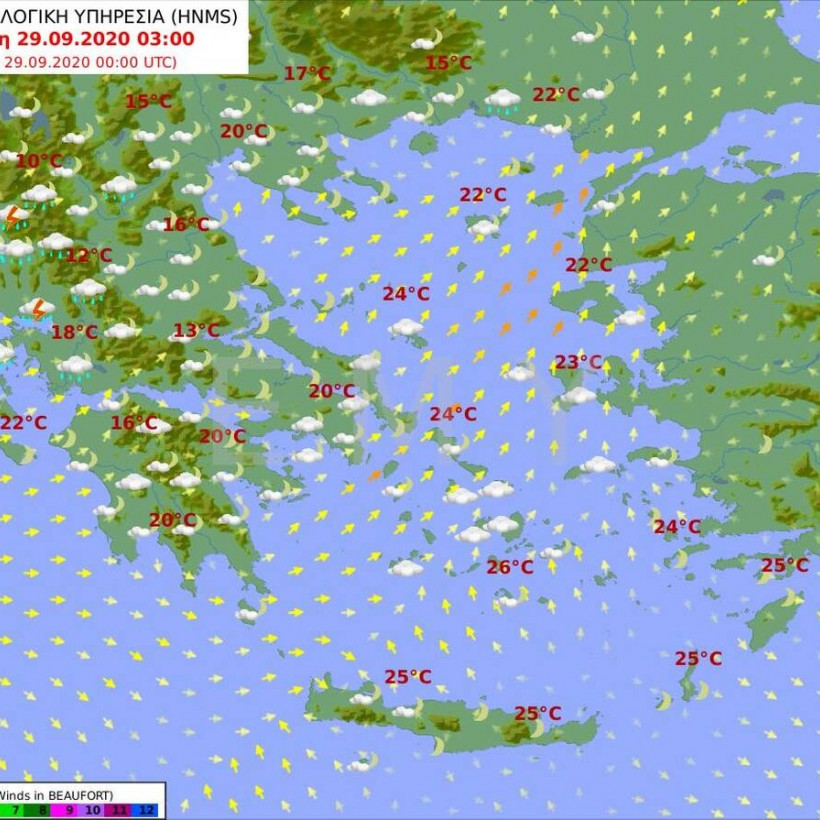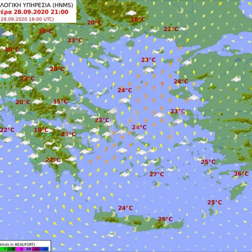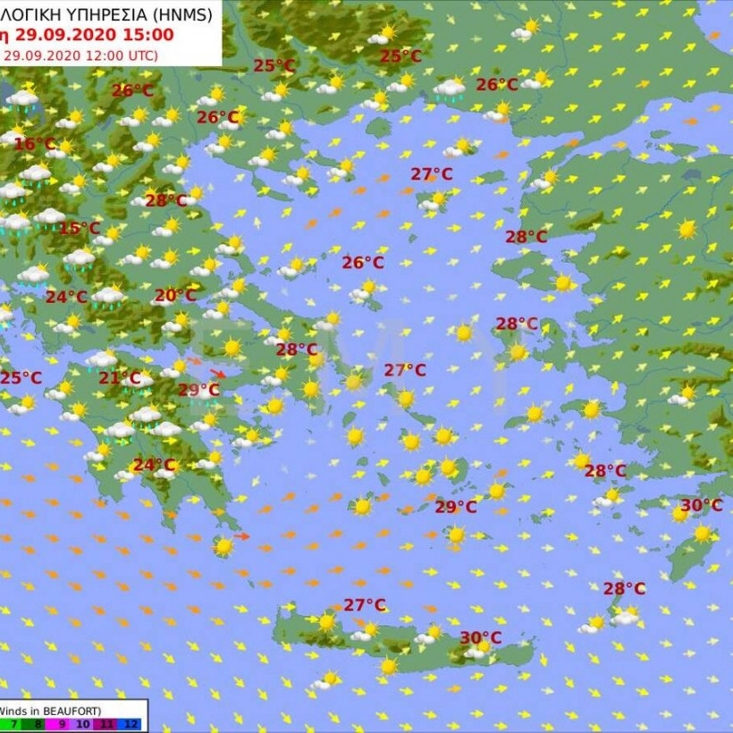 Θερμοκρασία: Από 22 έως 28 και τοπικά στην Κρήτη έως 30 βαθμούς Κελσίου.