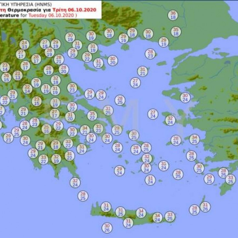 Θερμοκρασία: Από 21 έως 29 και στην Κρήτη έως 31 βαθμούς Κελσίου.