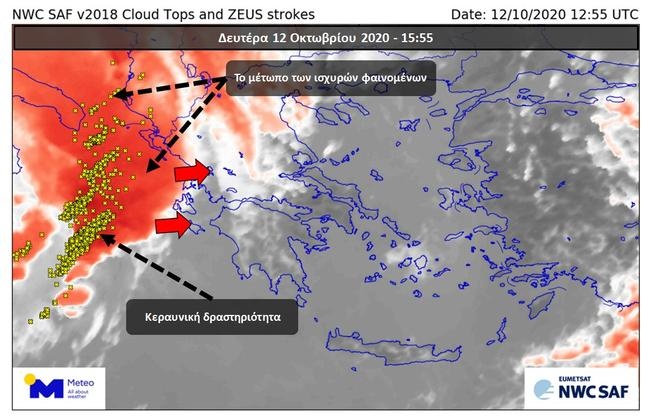 Στα ανοικτά του Ιονίου βρίσκεται τις πρώτες απογευματινές ώρες της Δευτέρας 12/10 το μέτωπο με τα ισχυρά φαινόμενα που αναμένουμε να επηρεάσει τη χώρα.