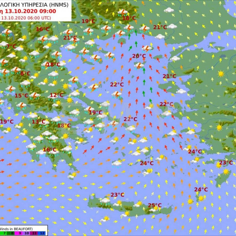 Κακοκαιρία προβλέπεται να επικρατήσει μέχρι το απόγευμα της Τρίτης (13-10-2020) στη χώρα από τα δυτικά, με κύρια χαρακτηριστικά τις ισχυρές βροχές και καταιγίδες που θα συνοδεύονται από χαλαζοπτώσεις και τους θυελλώδεις νότιους ανέμους εντάσεως 7 με 8 μποφόρ, οι οποίοι την Τρίτη θα φτάσουν στο βόρειο Αιγαίο έως 9 μποφόρ.