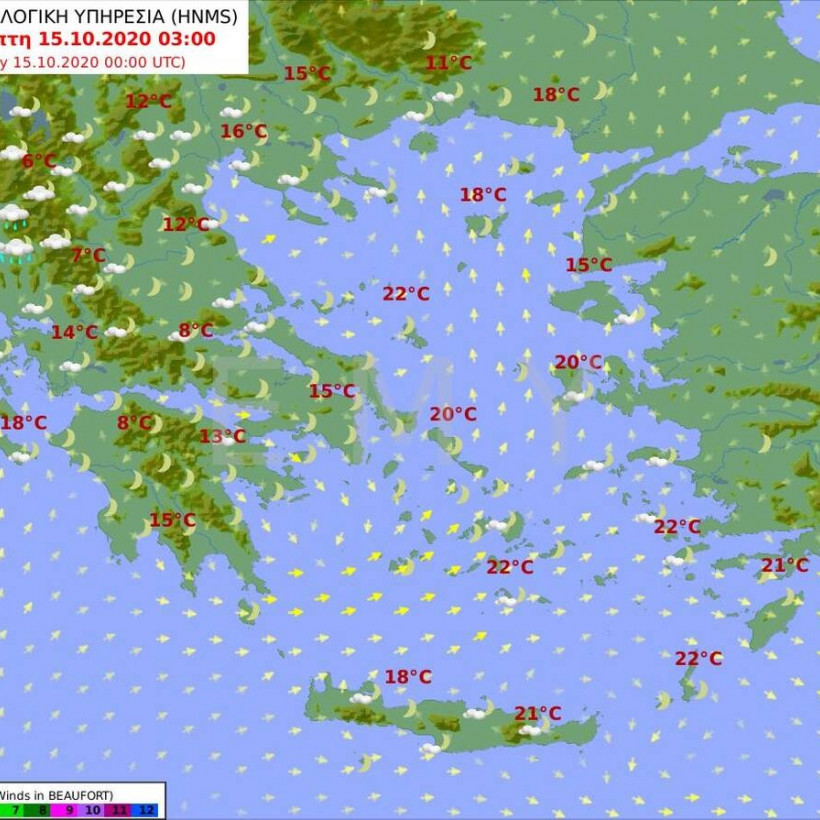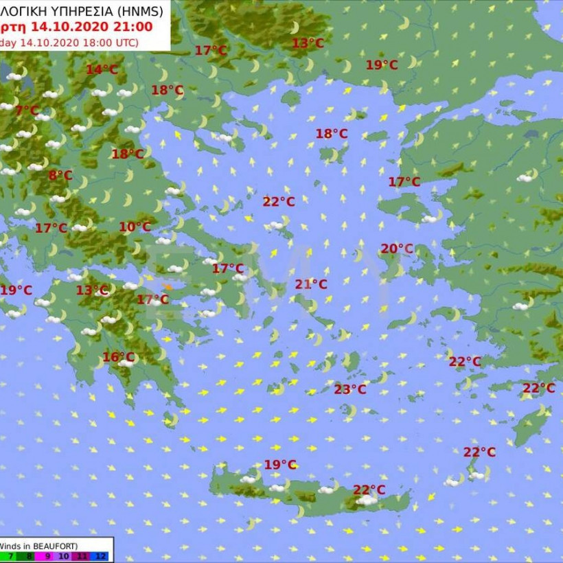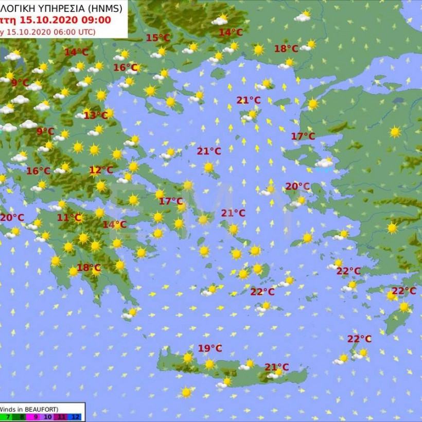Οι άνεμοι θα πνέουν από νότιες διευθύνσεις 3 με 5 και στα δυτικά 5 με 7 μποφόρ. Μόνο στα Δωδεκάνησα θα πνέουν δυτικοί βορειοδυτικοί 4 με 5 μποφόρ.