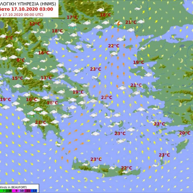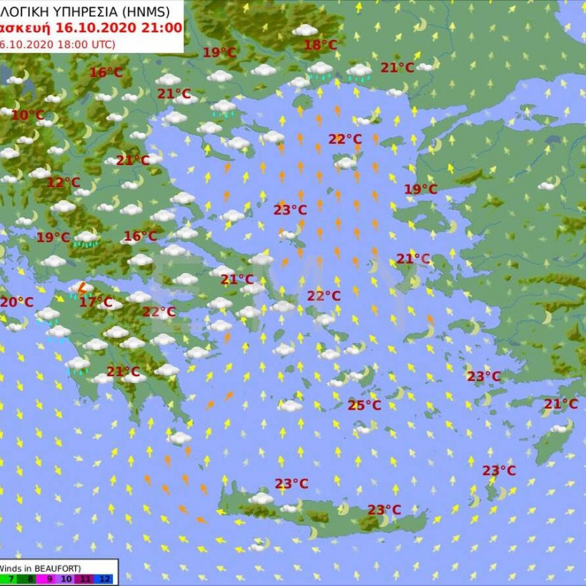 Άνεμοι: Από νότιες διευθύνσεις 4 με 6 και στα νότια τοπικά 7 μποφόρ.