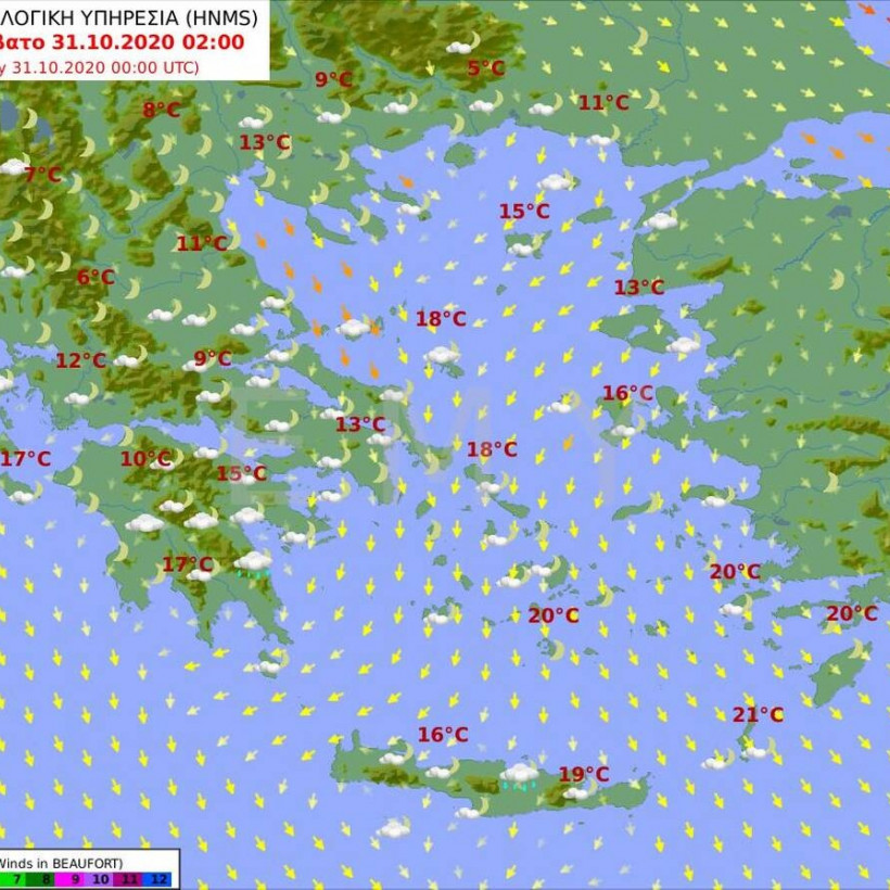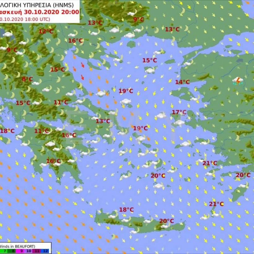Θερμοκρασία: Από 10 ως 20 βαθμούς Κελσίου. Στη δυτική Μακεδονία και τη Θράκη 2 με 3 βαθμούς χαμηλότερη.