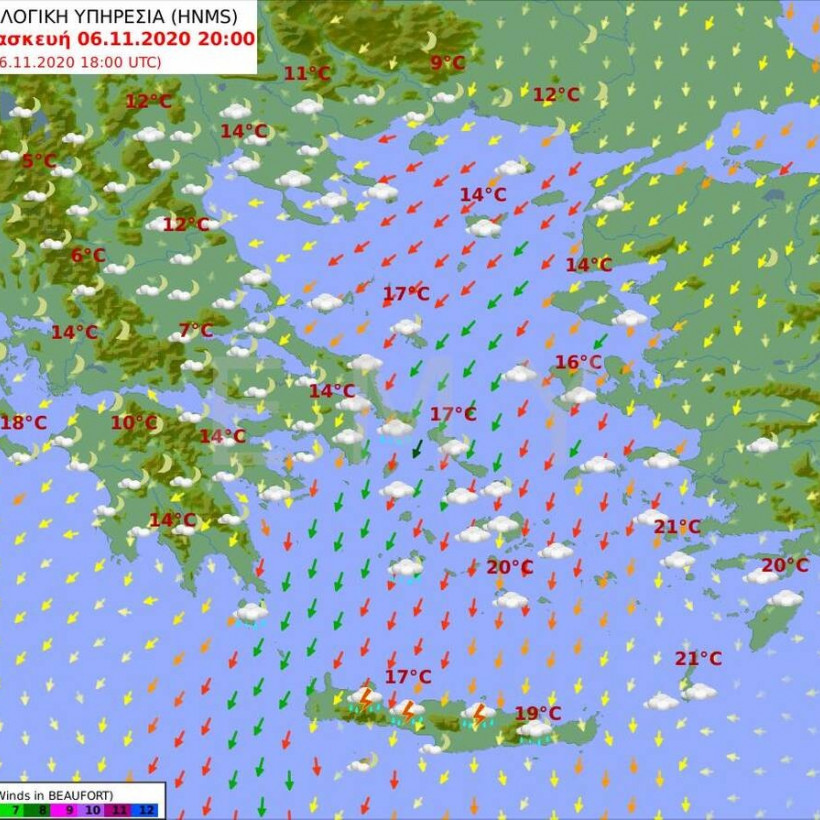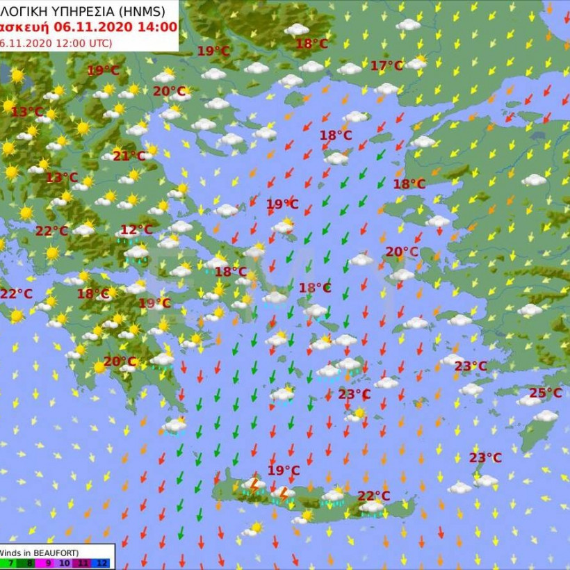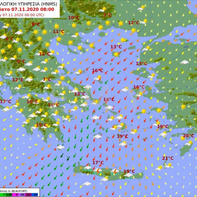 Άνεμοι: Βορειοανατολικοί 6 με 7 και στα ανατολικά και τα νότια τοπικά 8 μποφόρ.