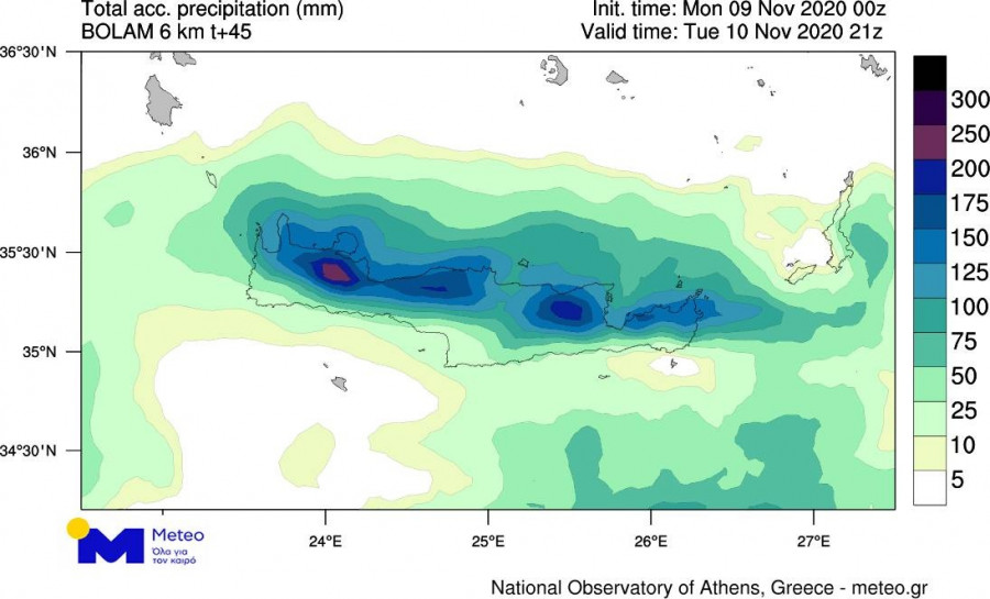 Επισημαίνεται ότι, η διάρκεια και η ένταση των βροχοπτώσεων, σε συνδυασμό με το ήδη κορεσμένο έδαφος (κυρίως στα ανατολικά τμήματα του νησιού), αυξάνουν σημαντικά την πιθανότητα να σημειωθούν πλημμυρικά φαινόμενα. Στον προγνωστικό χάρτη που ακολουθεί παρουσιάζονται τα εκτιμώμενα αθροιστικά ύψη βροχόπτωσης στην Κρήτη έως τις βραδινές ώρες της Τρίτης 10/11.