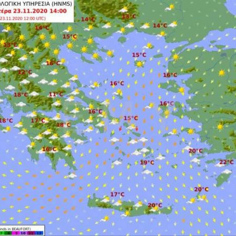 Οι άνεμοι πνέουν στα δυτικά ανατολικοί και στα ανατολικά βόρειοι βορειοανατολικοί 5 με 7 και στα πελάγη τοπικά 8 μποφόρ.